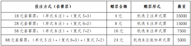 1.活动期间,凡在我省体彩实体店购买任意超级大乐透套餐票的购彩者,可现场获得对应金额的超级大乐透赠票。活动计划赠出6.25万张赠票,共计50万元,赠完即止。具体如下: